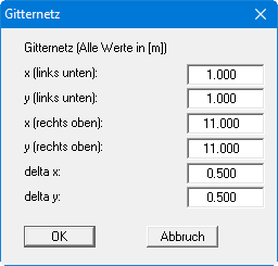 Es erscheint die folgende Dialogbox, in der Sie die Abmessungen und die Abstände in x- und y- Richtung eines Gitters definieren können: