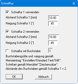 Das Programm zeichnet die Schraffur mit den Einstellungen, die Sie im Menüeintrag "Einstellen / Schraffur" ändern können: