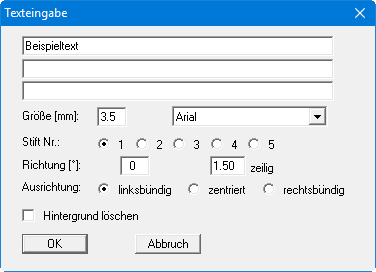 Geben Sie den gewünschten Text ein, unter Umständen in drei Zeilen, die entsprechend des eingegebenen Zeilenabstandes untereinander angeordnet werden. Schriftgröße, Schriftrichtung und Stiftnummer, mit denen der Text gezeichnet werden soll, können eingestellt werden. Die Standardvorgaben der obigen Dialogbox stellen Sie im Menüeintrag "Einstellen / Standard Text/Stift" ein.