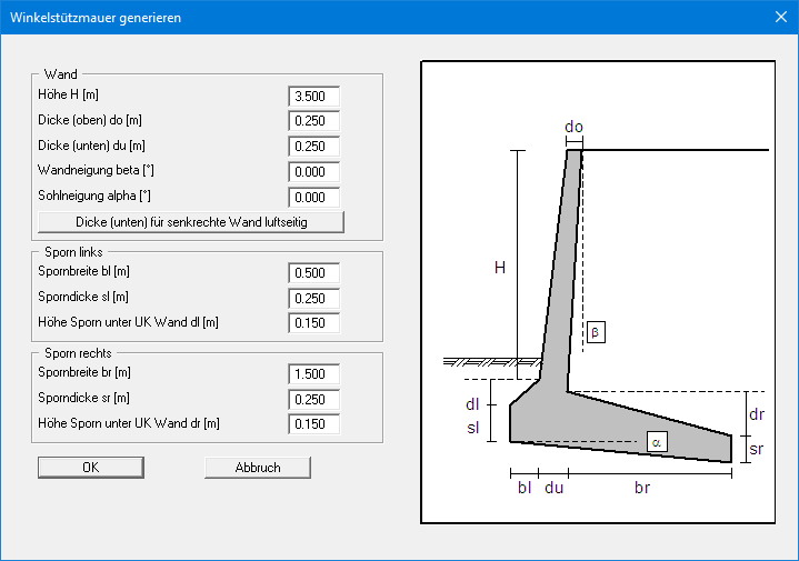 Die Definition der Winkelstützmauer erfolgt über den Menüeintrag "Editor 1 / Wand (Geometrie)". Die Grafik erläutert alle erforderlichen Eingaben.