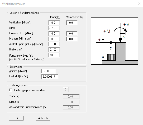 In der Dialogbox definieren Sie die Größe einer eventuell vorhandenen "Vertikallast" und "Horizontallast" am Wandkopf. Bei Verwendung des Teilsicherheitskonzeptes werden die Lasten in "Ständig(g)" und "Veränderlich(q)" unterteilt eingegeben. Mit dem Wert "x [m]" definieren Sie die Stellung der Vertikallast vom rechten oberen Rand der Winkelstützmauer. Des Weiteren kann eine Momentenbelastung auf die Wand und eine zusätzliche Last auf den linken Sporn definiert werden.