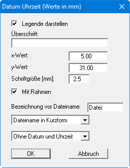 In der Grundeinstellung des Programms ist diese Legende deaktiviert. Wenn Sie in der Dialogbox dieses Menüeintrages den Schalter "Legende darstellen" aktivieren, wird das Element in der grafischen Darstellung auf Ihrem Ausgabeblatt eingeblendet. Sie können in der Dialogbox dieses Menüeintrages eine Überschrift eingeben und die Art der Darstellung des Dateinamens auswählen. Bei der Einstellung "Dateiname vollständig" wird der Dateiname mit vollständiger Pfadangabe dargestellt. Mit "x-Wert" und "y-Wert" definieren und verändern Sie die Lage der Legende auf dem Ausgabeblatt. Über die "Schriftgröße" steuern Sie die Größe der Legende.