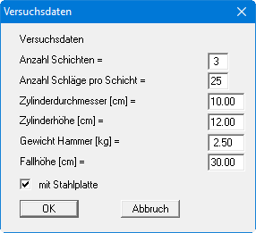 Sie können in der Dialogbox die Versuchsdaten (Schlagzahl pro Schicht, usw.) eingeben. Die Werte werden bei der grafischen Darstellung nicht berücksichtigt. Sie sind nur bei der Ausgabe des Versuchsprotokolls von Bedeutung. Die Darstellung aktivieren Sie über den Menüeintrag "Formblatt / Versuchsdaten".