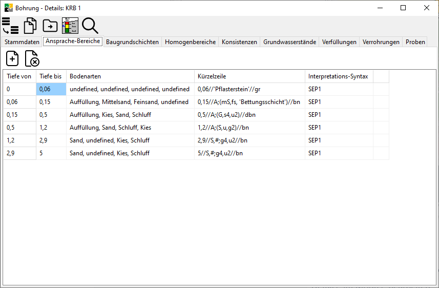 Die Bohrung muss Ansprachebereiche mit Kürzelzeilen enthalten