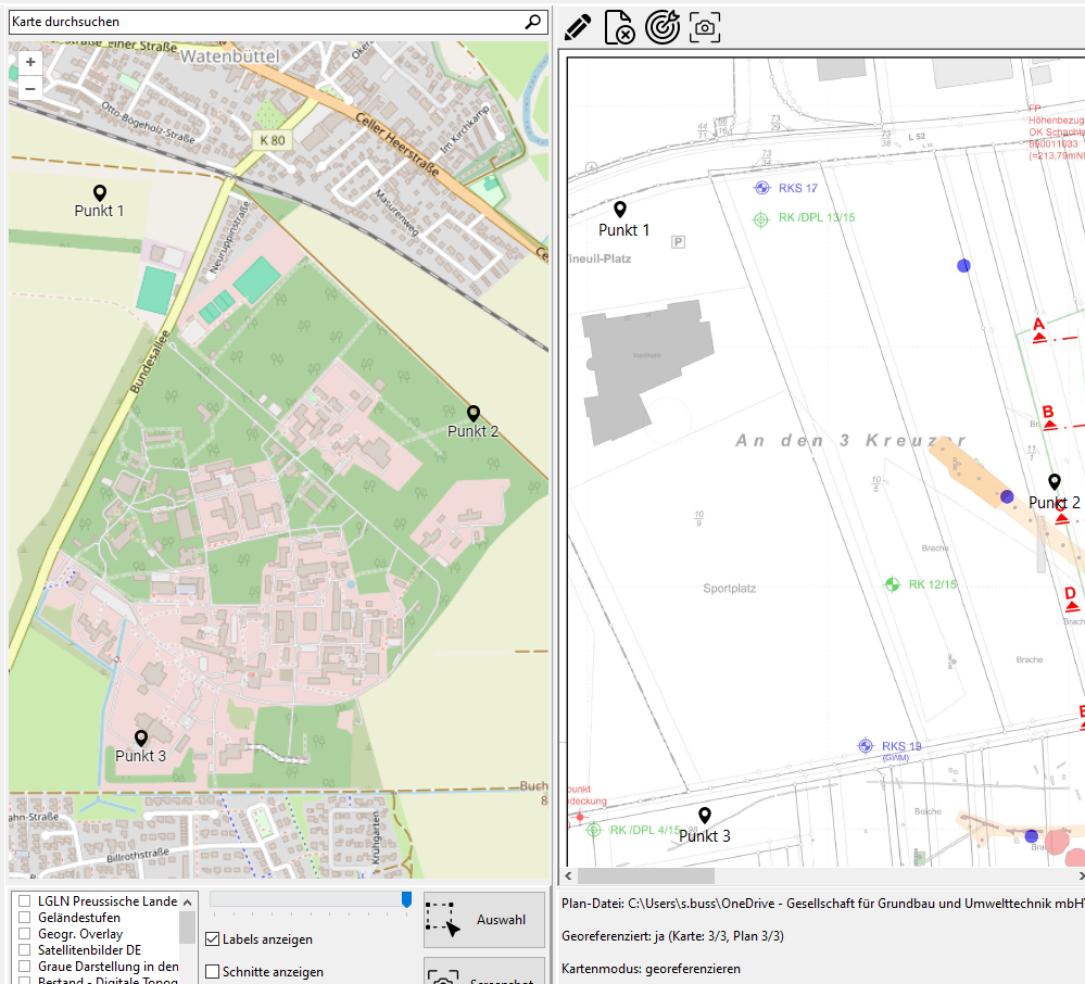 Dazu müssen im Plan und in der Karte jeweils drei Punkte definiert werden, die sich entsprechen. Es eignen sich insbesondere markante Punkte wie Gebäude, Straßenkrezuungen o.ä.