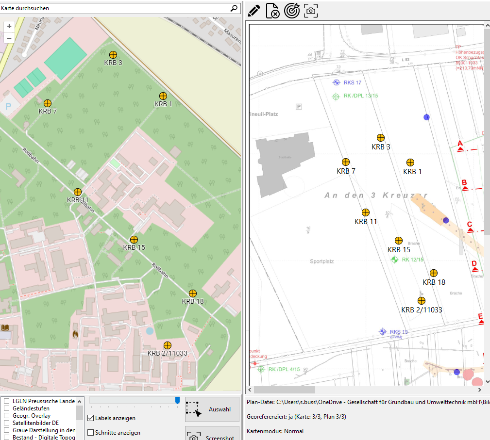 Daraufhin können Sie wieder den Plan georeferenzieren Button drücken und es werden die Aufschlüsse sowohl in der Karte als auch im Plan angezeigt und können in beiden dynamisch an- und abgeschaltet, erzeugt usw. werden.