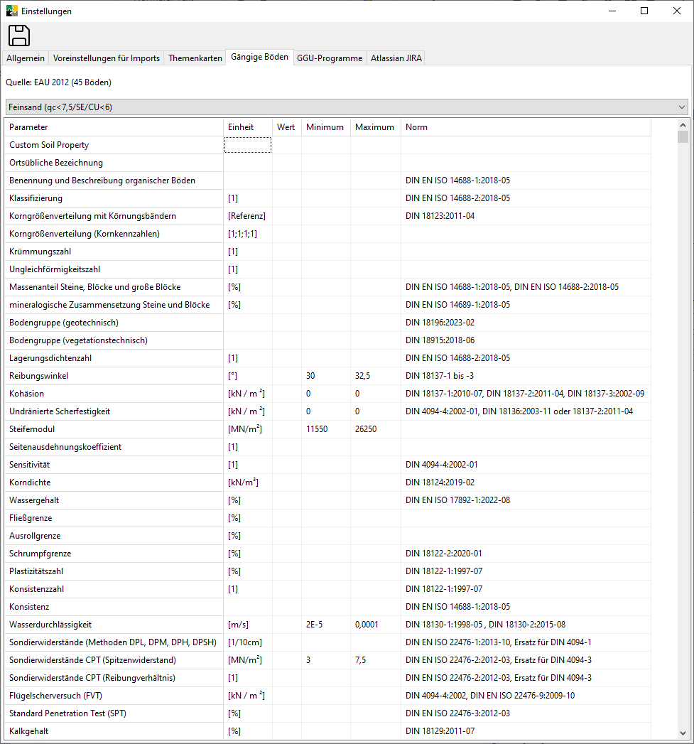 In GGU-CONNECT können Modellschichten und Homogenbereichen Kennwerte aus gängigen Böden zugeordnet werden. Aktuell sind die Böden aus der EAU 2012 hinterlegt. Unter Einstellungen → Gängige Böden kann man die Werte einsehen. Anwenden kann die Werte in den Dialogen zur Baugrundmodellierung, vgl. GGU-CONNECT - Dialoge zur Baugrundmodellierung