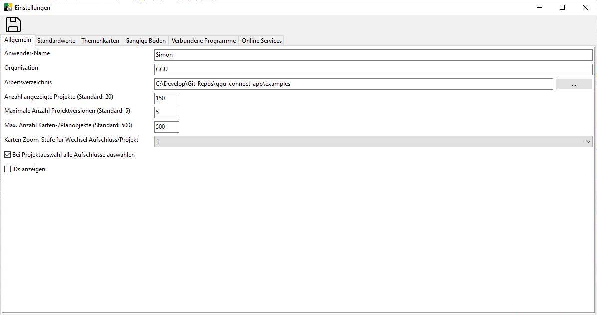 IDs anzeigen (Standard: aus) | Wenn aktiviert, werden die internen IDs der Fachobjekte (Bohrung etc.) in Listendarstellungen etc. mit angezeigt. |