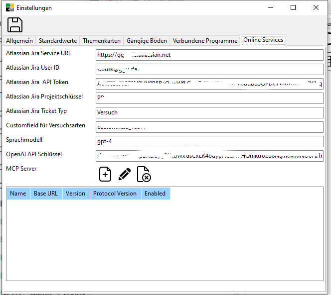 In diesem Bereich können Model Context Protocol (https://modelcontextprotocol.io/introduction ) Server konfiguriert werden, mit denen man im KI Chat (vgl. GGU-CONNECT - Menü "KI" ) interagieren kann.