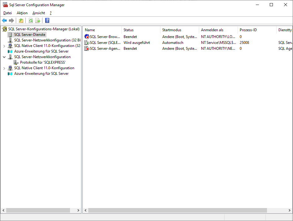 Danach im dann installierten Programm “Sql Server Configuration Manager“ schauen, ob der Dienst “SQL Server (SQLEXPRESS)“ läuft.