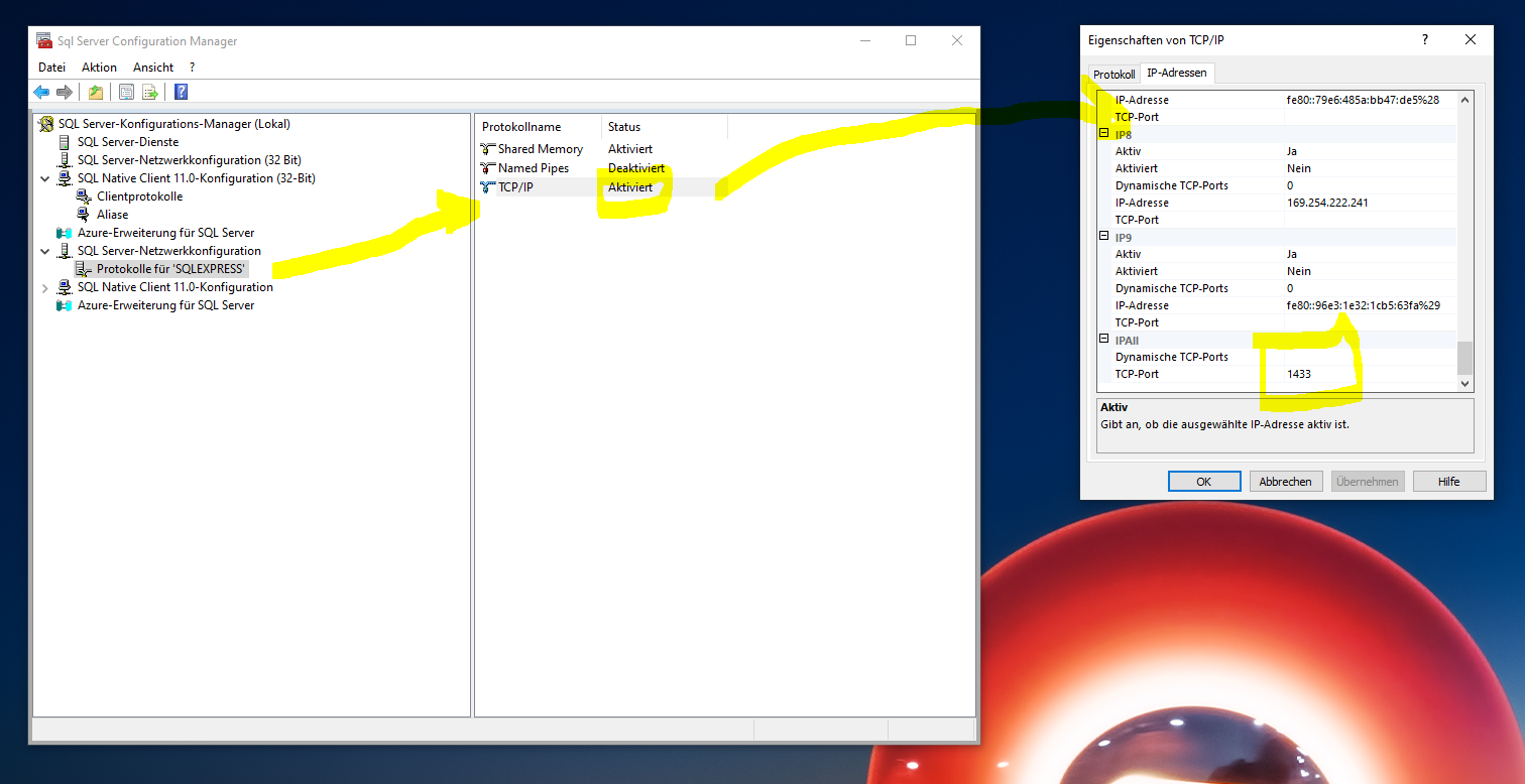 Herunterscrollen zu IPAll: Dort “Dynamische Ports” leeren und TCP-Port belegen mit z.B. 1433