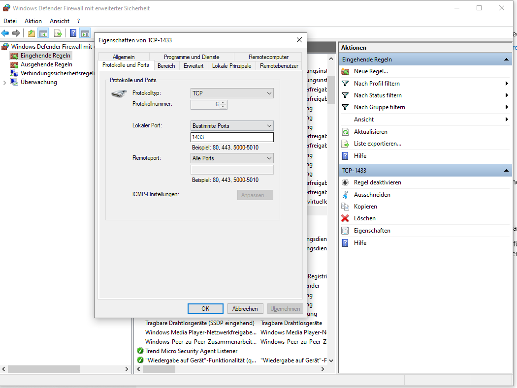 Port: <wie oben gewählt, im Beispiel 1433>