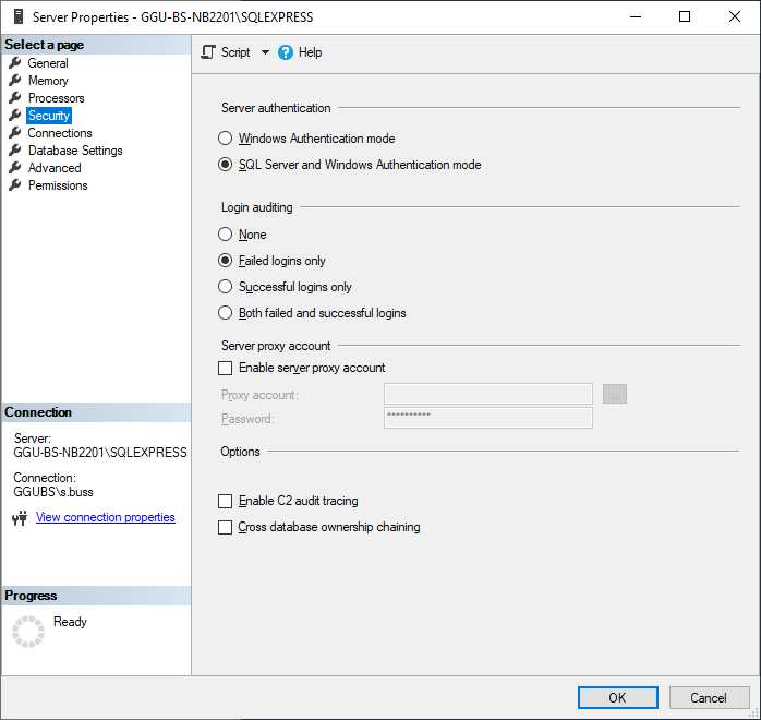 und dann bei “Server Authentication mode“ auswählen: “SQL Server and Windows Authentication Mode“