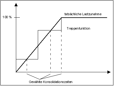 Die bisherigen Erläuterungen gingen davon aus, dass die Belastung unmittelbar aufgebracht wird. Im Allgemeinen erfolgt jedoch eine kontinuierliche Lastaufbringung während der Herstellphase des Bauwerks. Dieser Effekt kann im Programm berücksichtigt werden. Dazu definieren Sie die Form der Lastzunahme als Polygonzug über die Zeit. Eine z.B. lineare Zunahme wird dann in eine Treppenfunktion umgerechnet. Die Form der Treppenfunktion ist abhängig von den gewählten Zeiten, die Sie für die Berechnung der Konsolidation angeben.