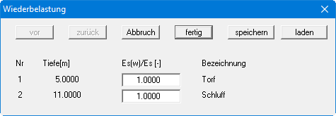 In der Dialogbox definieren Sie für jeden Boden das Verhältnis zwischen dem Steifemodul in der Wiederbelastung und dem Steifemodul der Erstbelastung. Wenn Sie mit dem Kompressionsbeiwert CC arbeiten, definieren Sie entsprechend CC/Cs.