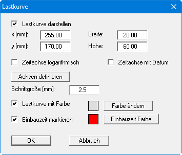 Sie können eine logarithmische Zeitachse aktivieren oder eine zusätzliche Darstellung des Datums auf der Zeitachse. Dazu muss in der Dialogbox des Menüeintrages "Datei / Neu" bzw. "Bearbeiten / Art der Konsolidation" die Datumsfunktion aktiviert sein. Über den Knopf "Achsen definieren" können Sie die vom Programm gewählten Achsen ändern. Dazu legen Sie in der sich öffnenden Dialogbox fest, welche Zeiten und welche Lastwerte als Minimal- und Maximalwerte für x- und y-Achse verwendet werden sollen.