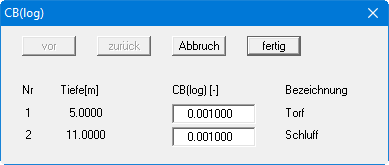 Sie können hier für Ihre Bodenschichten den jeweiligen Bodenkennwert CB(log) definieren (siehe "Theoretische Grundlagen: Sekundärsetzungen").
