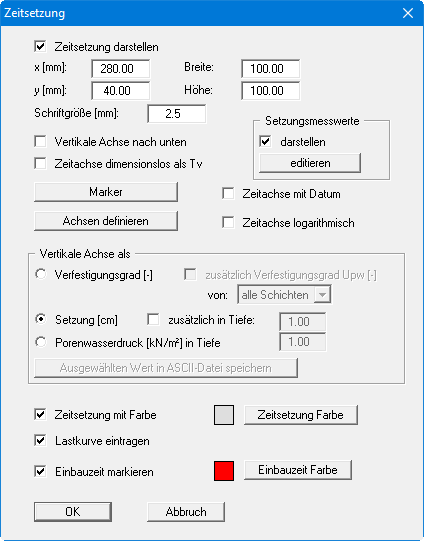 Im unteren Bereich der Dialogbox können Sie weitere Darstellungselemente aktivieren, u.a. können Sie den Zeitsetzungsbereich farbig hinterlegen lassen. Wenn Sie eine Lastzunahme definiert haben, kann die der Berechnung zugrunde liegende Treppenfunktion mit dem Knopf "Lastkurve eintragen" in die Grafik aufgenommen werden. Damit sparen Sie sich die gesonderte Darstellung der Lastkurve (siehe Menüeintrag “Formblatt / Lastkurve”). Die Einstellung von Farbe und Stiftbreite für die Lastkurve können Sie im Menüeintrag "Ansicht / Stifte" verändern. Bei nachträglichem Einbau von Vertikaldränagen (Konsolidationsart "Konsolidation mit beiden Typen (numerisch)") können Sie zusätzlich die Einbauzeit in der gewünschten Farbe markieren lassen.