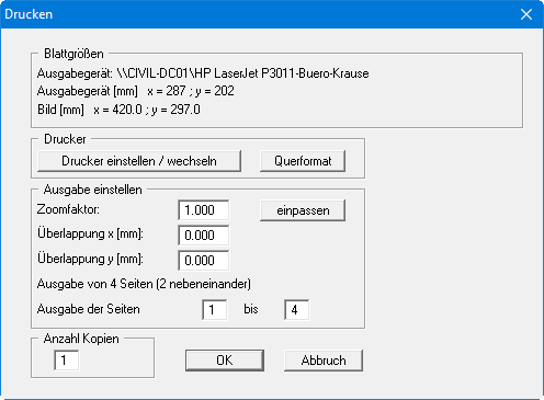Im oberen Teil der Dialogbox werden die maximalen Abmessungen angegeben, die der ausgewählte Drucker beherrscht. Darunter können die Abmessungen der auszugebenden Zeichnung abgelesen werden. Wenn die Zeichnung größer als das Ausgabeformat des Druckers ist, wird die Zeichnung auf mehrere Blätter gedruckt (im obigen Beispiel 4). Um die Zeichnung später besser zusammenfügen zu können, besteht die Möglichkeit, zwischen den einzelnen Teilausgaben der Zeichnung eine Überlappung in x- und y-Richtung einzustellen. Alternativ besteht auch die Möglichkeit, einen kleineren Zoomfaktor zu wählen, der die Ausgabe eines einzelnen Blattes sicherstellt (Knopf "einpassen"). Anschließend kann dann auf einem Kopierer wieder auf das Originalformat vergrößert werden, um die Maßstabstreue zu sichern. Außerdem kann die Anzahl der Kopien eingegeben werden.