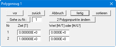 Über den Knopf "2 Polygonpunkte ändern" bestimmen Sie die Anzahl der Aufpunkte des Polygonzuges. Sie haben die Möglichkeit, bis zu 100 Polygonpunkte zu definieren. Für Ihre Aufpunkte definieren Sie anschließend die Zeitabfolge mit dem zugehörigen Wert der Randbedingung. Achten Sie dabei auf die Dimensionen, die Sie verwenden. Das Programm GGU-CONTAM-FE arbeitet dimensionsecht. Daher muss die Zeit in der Zeitdimension eingegeben werden, die Sie bei der Durchlässigkeit benutzt haben. Der Wert des Polygons muss in Masse/Zeit (z.B. mg/s) für Konzentrationsquellen bzw. in Masse/Länge³ für Konzentrationen eingegeben werden. Die Längendimension muss wiederum zur Längendimension der Durchlässigkeit passen. Wenn Sie einen Polygonpunkt einfügen wollen, geben Sie diesen als zusätzlichen Wert am Ende der Tabelle ein und wählen anschließend den Schalter "sortieren".