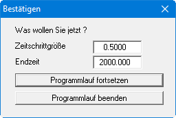 Nach der Anwahl des "OK"-Knopfes wird die eigentliche Berechnung gestartet. In einer Dialogbox wird Ihnen dabei der Berechnungs-Fortschritt angezeigt. Bei sehr lang dauernden Berechnungen können Sie mit dem Knopf "Abbrechen" die Berechnung zunächst unterbrechen. Sie haben dann in einer weiteren Dialogbox die Möglichkeit, die Berechnung zu beenden oder die Zeitschrittgröße und/oder Endzeit zu verändern und anschließend den Rechenlauf fort zu setzen.