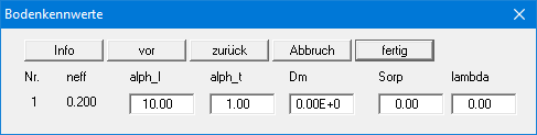 Nach Auswahl dieses Menüeintrages erscheint eine Dialogbox zur Eingabe der Bodenkennwerte. Der vom Programm GGU-2D-SSFLOW übergebene stationäre Kennwert neff kann hier nicht mehr verändert werden.