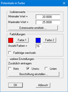 Mit "Anzahl Farben ="steuern Sie die Farbunterteilung des Isolinienplans. Im obigen Beispiel würden 16 Farbabstufungen zwischen den Farben "Farbe 1" und "Farbe 2" vorgenommen werden. Voreingestellt ist ein Verlauf von rot nach blau. Sie können diese beiden Farben nach Anwahl der Knöpfe "Farbe 1" bzw. "Farbe 2" beliebig verändern oder einfach über den Schalter "Farbfolge wechseln" den Farbverlauf umdrehen.Bereich "weitere Einstellungen"