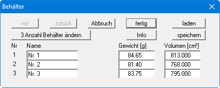 Wenn Sie bei Ihren Versuchen standardmäßig ausgewogene Behälter verwenden, können Sie deren Gewichte über die Dialogbox dieses Menüeintrages in einer Behälter-Datenbank abspeichern.