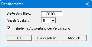 Möchten Sie in Ihrer Tabelle auch die Auswertung der Verdichtung dargestellt haben, aktivieren Sie den entsprechenden Knopf. Wenn der Knopf deaktiviert ist, werden die Zeilen mit den anderen Versuchsdaten über die gesamte Tabellenhöhe verteilt. Sie haben dann sehr breite Tabellenzeilen.