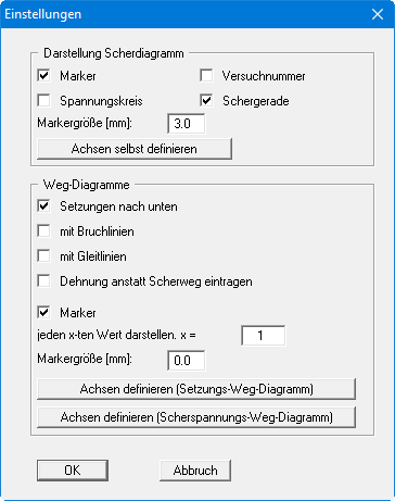 Für das Setzungs-Weg-Diagramm können Sie eine Darstellung der Setzungen nach unten aktivieren. Im Scherspannungs-Weg-Diagramm können durch Aktivieren der entsprechenden Schalter die Bruch- und Gleitlinien mit gestrichelten Linien markiert werden.
