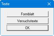 Wenn Sie auf den Knopf "Versuchstexte" in der obigen Auswahlbox klicken, erhalten Sie die folgende Dialogbox, in der Sie die Beschriftung der Eingabefelder für die Versuchsdaten und die Tabellendarstellung der Versuchswerte auf dem Formblatt bearbeiten können: