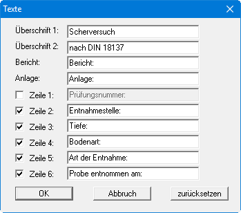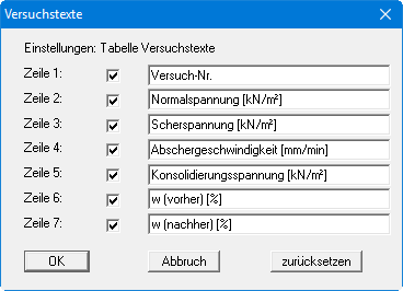 Je nachdem, ob Sie unter "Bearbeiten / Versuchsart" einen Scherversuch oder einen Dreiaxialversuch gewählt haben (siehe Abschnitt 5.2.1), erhalten Sie in der obigen Dialogbox die entsprechenden Parameter als Vorlage angezeigt. Wenn Sie in der Dialogbox Zeilen deaktivieren, werden die Eingabefelder in der Dialogbox "Versuche" ebenfalls deaktiviert (siehe Abschnitt 5.2.2.2). In der Tabelle der Versuchswerte auf dem Formblatt werden diese Zeilen gänzlich ausgeblendet.