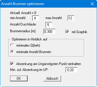 Übernehmen Sie Ihre bisherigen Einstellungen für die Baugrube mit "ja" und wählen Sie anschließend erneut den Menüeintrag "System / optimieren". Nach Klicken auf den Knopf "Anzahl Brunnen" erhalten Sie eine etwas andere Dialogbox: