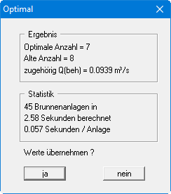 Die Brunnenanzahl ist auf "7" reduziert. Bestätigen Sie das Ergebnis mit "ja" und berechnen Sie die optimierte Anlage erneut.