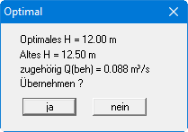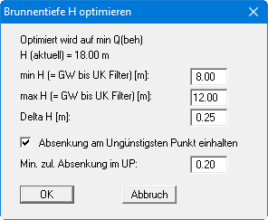 Geben Sie mit minimale und maximale Brunnentiefe H (min H, max H) an, in welchem Bereich das Programm variieren soll. Mit der Eingabe hinter "Delta H" definieren Sie den Variationsabstand. Darunter legen Sie fest, ob eine minimale Absenkung im Ungünstigsten Punkt nicht unterschritten werden darf. Brunnentiefen, die bei Aktivierung des Schalters diese Bedingung nicht einhalten, werden abgelehnt. Nach Abschluss der Optimierung erhalten Sie das Ergebnis angezeigt und können die optimierte Brunnentiefe übernehmen lassen. Führen Sie anschließend eine Neuberechnung des optimierten Systems durch.