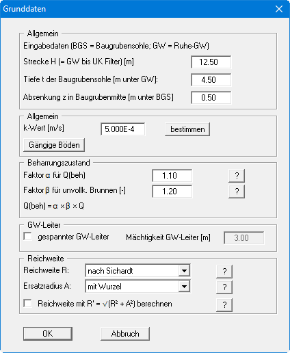 Standardmäßig wird von einem ungespannten Grundwasserleiter ausgegangen. Liegt ein gespanntes System vor, aktivieren Sie den Schalter "gespannter GW-Leiter" und geben zusätzlich die Mächtigkeit des Grundwasserleiters ein. Hinsichtlich der Festlegungsart der Reichweite und der Berechnung des Ersatzradius wird auf die Infos verwiesen, die Sie über die jeweiligen Knöpfe abrufen können. Nach der Anpassung Ihrer Daten übernehmen Sie diese mit dem Knopf "OK".