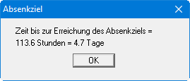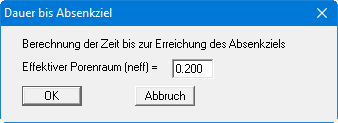 Über diesen Menüeintrag erhalten Sie eine Abschätzung der Zeit bis zur Erreichung des Absenkziels. In der folgenden Dialogbox müssen Sie den effektiven Porenraum eingeben und mit "OK" die Berechnung starten.