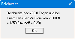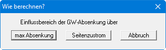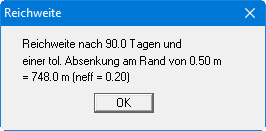 Über den Menüpunkt wird die Berechnung der Reichweite der Absenkung in Abhängigkeit der Dauer der Grundwasserabsenkung [Tage] vorgenommen.