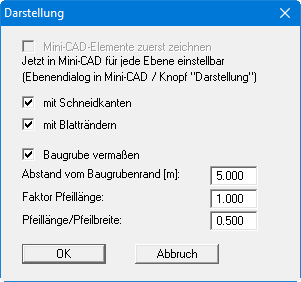 Durch Deaktivierung der entsprechenden Schalter können Sie die unter dem Menüeintrag “Blatt / Blattformat" definierten Schneidkanten und Blattränder ausblenden. Ist der Schalter "Baugrube vermaßen" aktiviert, können Sie in den nachfolgenden Eingabefeldern den Abstand zum Baugrubenrand sowie Länge und Breite der Bemaßungspfeile festlegen.