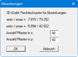 Mit diesem Menüeintrag können Sie Isolinien dreidimensional in einem Rechteckraster darstellen lassen. Nach der Wahl der Absenkungsform legen Sie in der Dialogbox zunächst das Raster durch Eingabe der Unterteilungen in x und y (Pflaster) fest:
