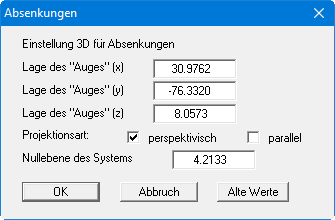 Hier wählen Sie zunächst den Betrachtungspunkt (Lage des Auges in x-, y- und z-Koordinaten) sowie die Projektionsart und die Nullebene der 3D-Darstellung. Von der Nullebene (z-Ordinate) aus werden die Absenkungen nach oben oder nach unten dreidimensional aufgetragen. Im Allgemeinen macht das Programm für die Eingabewerte dieser Dialogbox sinnvolle Vorgaben, so dass Sie Änderungen nicht vornehmen müssen.