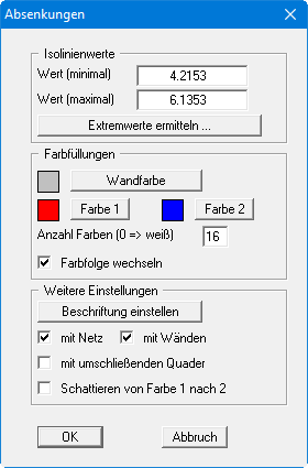 Nach Verlassen der Dialogbox mit "OK" erhalten Sie folgende Dialogbox, die im Wesentlichen der Box unter dem Menüeintrag “Auswertung / Isolinien farbig" gleicht.