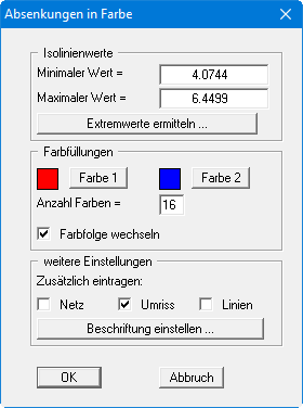 Mit dem Knopf "Extremwerte ermitteln …" veranlassen Sie die Berechnung der minimalen und maximalen Absenkungen, die anschließend in die entsprechenden Eingabeboxen eingetragen werden. Sie müssen diese Werte jedoch nicht beibehalten, sondern können eigene Werte vorgeben. Eine Ausrundung von Isolinien kann hier nicht vorgenommen werden.Bereich "Farbfüllungen"