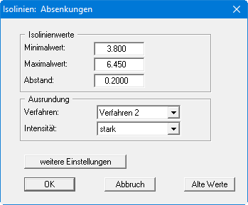 Das Programm zeigt Ihnen den vorhandenen kleinsten und größten Messwert und den Abstand, mit dem die Isolinien gezeichnet werden. Wenn die Darstellung mit einem anderen Wert als dem Messwert beginnen soll, können Sie hier die gewünschte Anfangsgröße eingeben. Ebenso können Sie den Abstand variieren, um z.B. die Anzahl der gezeichneten Isolinien zu reduzieren. Es erscheinen immer die vom Programm automatisch ausgewählten Einstellungen. Über den Knopf "Alte Werte" werden die Einstellungen übernommen, die Sie bei der vorherigen Isoliniendarstellung eingegeben haben.