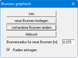 Über den Knopf "Info" erhalten Sie Informationen über das grafische Festlegen der Brunnen. Wenn Sie eine bereits vorhandene Brunnenanlage durch Hinzufügen oder Löschen einzelner Brunnen ändern möchten, wählen Sie den Knopf "vorhandene Brunnen ändern". Sollen alle bereits vorhandenen Brunnen vorab gelöscht werden, wählen Sie den Schalter "neue Brunnen festlegen". Anschließend können Sie durch Klicken der linken Maustaste neue Brunnen positionieren bzw. durch Klicken der rechten Maustaste vorhandene Brunnen löschen. Bei Aktivierung des Schalters "Radien eintragen" wird der Brunnenradius bei der grafischen Darstellung angezeigt, ansonsten sehen Sie in der Grafik die Nummern der Brunnen (siehe Menüeintrag “Bearbeiten / darstellen").