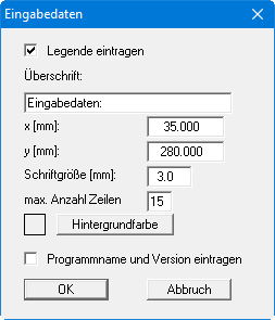 In der Allgemeinen Legende können bei Aktivierung des Schalters der Programmname und die Version mit dargestellt werden. Wenn Sie eine Datensatzbezeichnung eingegeben haben (siehe Abschnitt 8.2.1), wird diese ebenfalls in der Legende Eingabedaten dargestellt.