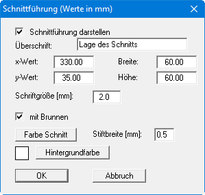 Sollen die Brunnen in der Skizze angezeigt werden, aktivieren Sie den entsprechenden Schalter. Die Schnittführungslinie können Sie über den Knopf "Farbe Schnitt" und die Eingabe im Feld "Stiftbreite" ändern.