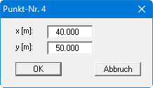Über diesen Menüeintrag können Sie die Koordinaten der Baugrubeneckpunkte bearbeiten. Nach Anklicken des gewünschten Eckpunktes mit der linken Maustaste erhalten Sie beispielsweise folgende Editorbox, in der Sie die Koordinaten des Punktes verändern können.