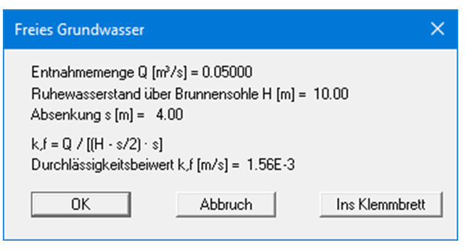 Sie können eine einfache Auswertung eines Pumpversuchs durchführen. Dabei haben Sie die Auswahl zwischen gespanntem und freiem Grundwasser. Sie erhalten beispielsweise folgende Auswertung in einer Infobox angezeigt.