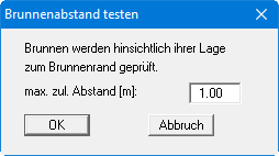 Dieser Menüeintrag ist nur bei rechteckigen Baugruben aktiviert. Wenn Sie Brunnen über den Menüeintrag “Bearbeiten /Lage der Brunnen (graphisch)" mit der Maus definiert haben und nicht wissen, ob ein bestimmter Abstand zum Baugrubenrand eingehalten wird, können Sie dies über diesen Menüeintrag überprüfen lassen.
